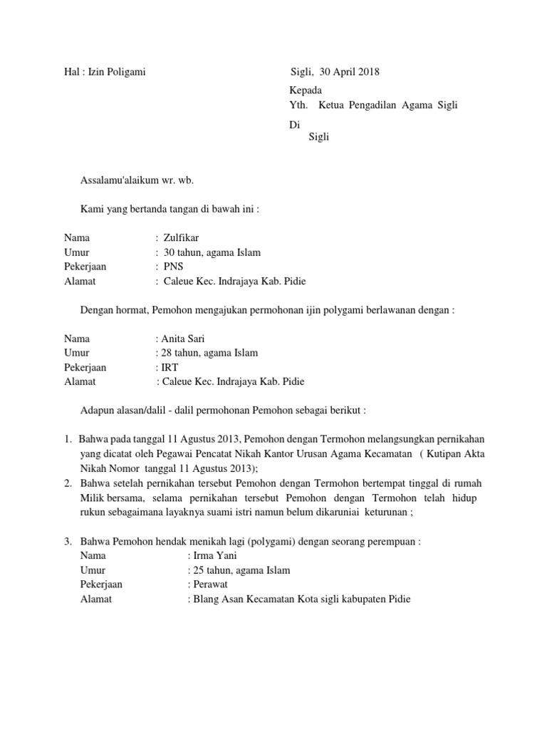 Contoh permohonan izin poligamidocx from LAW 1 at Mulawarman University. Dalam pernyataannya harus ditulis dengan sangat jelas dan dapat dipertanggung jawabkan. Artinya jika bisa adil maka poligami boleh dilakukan.